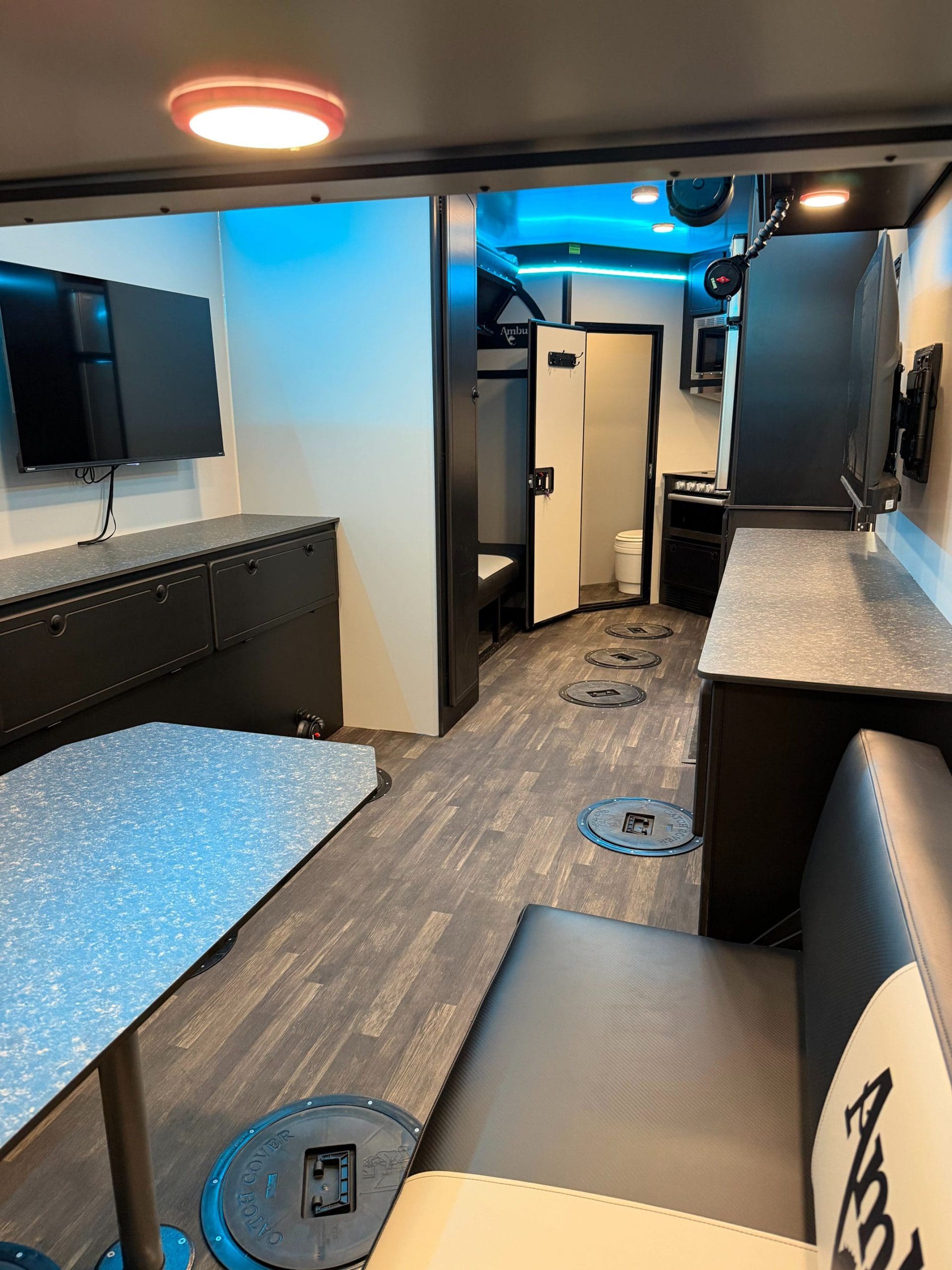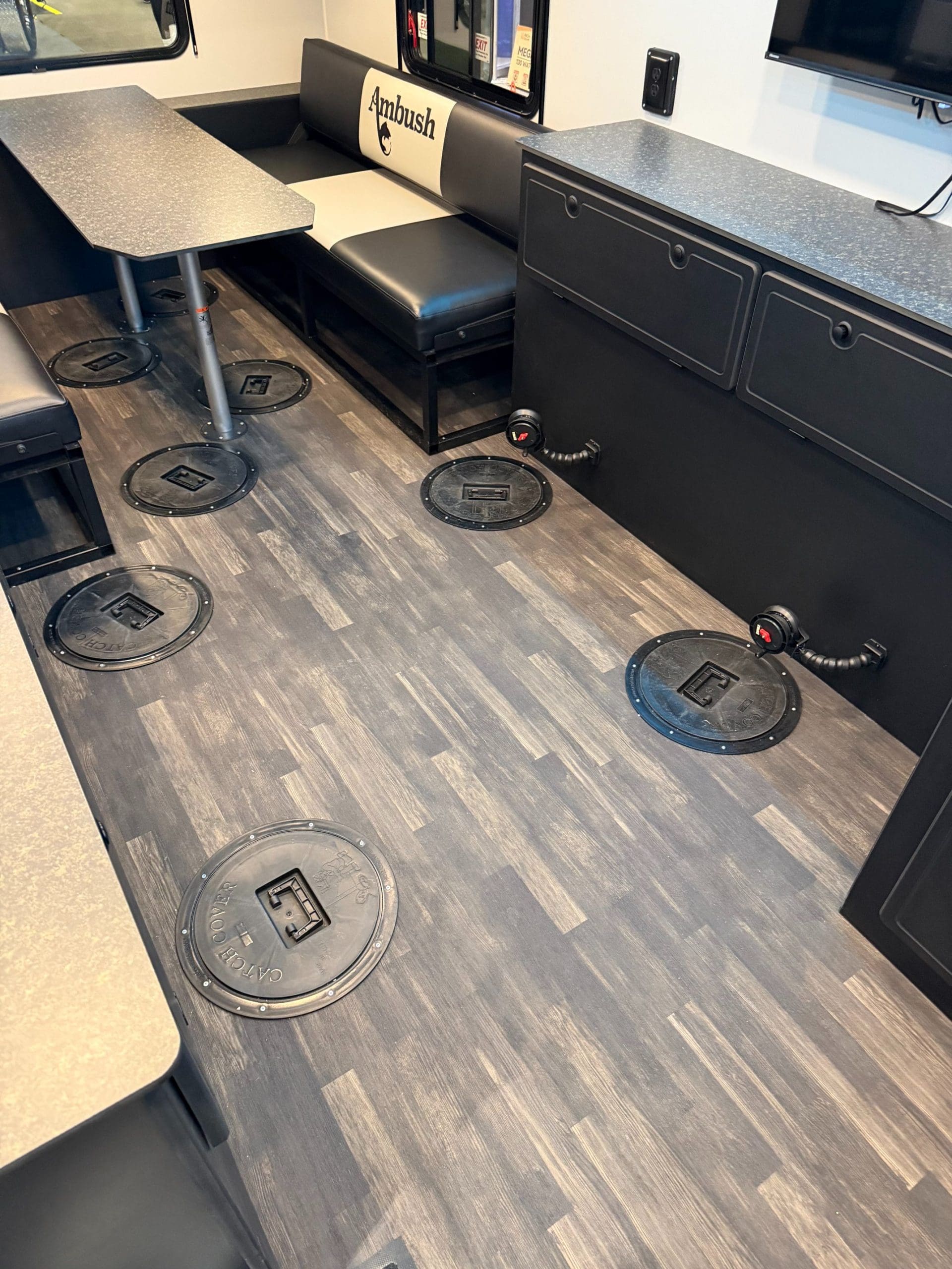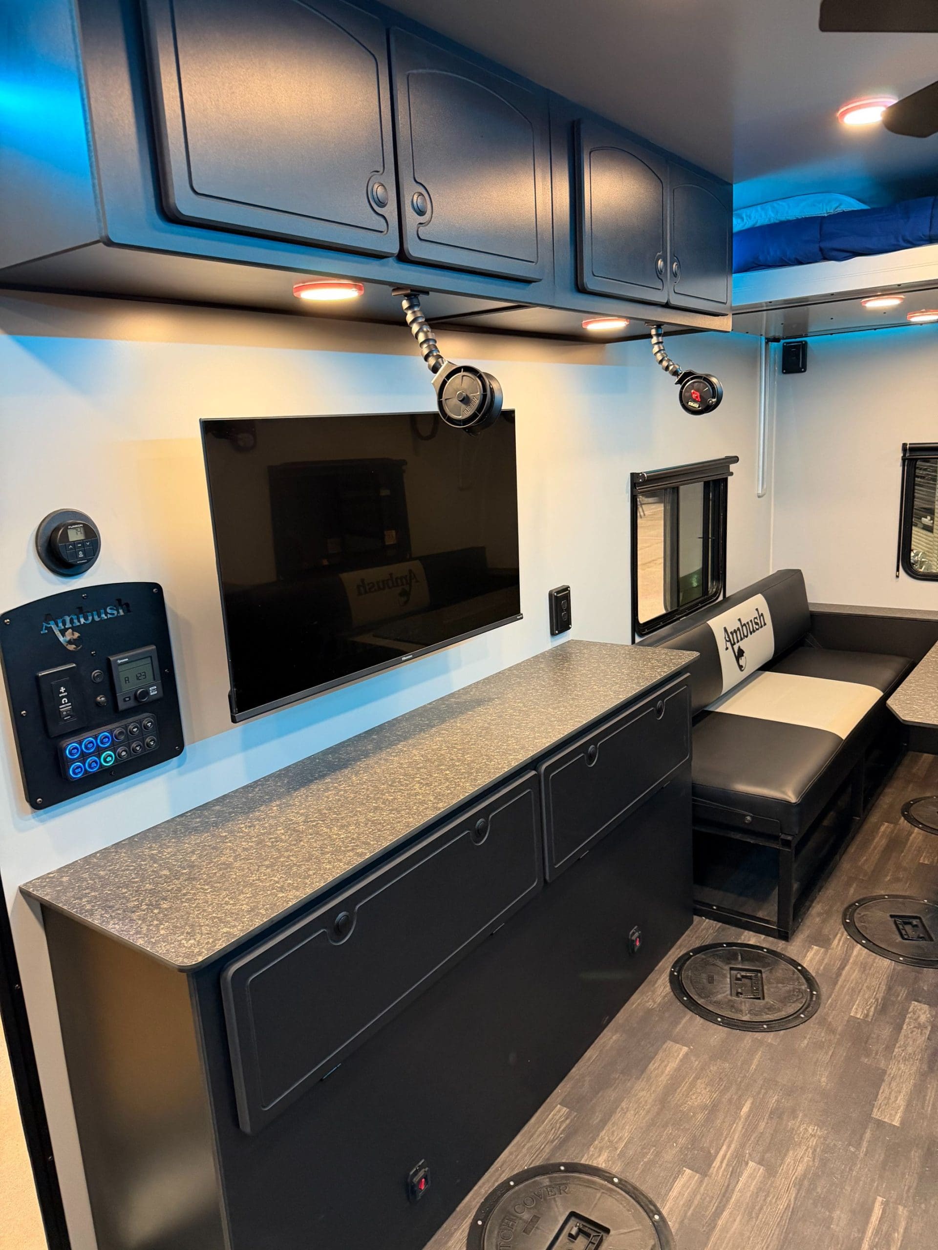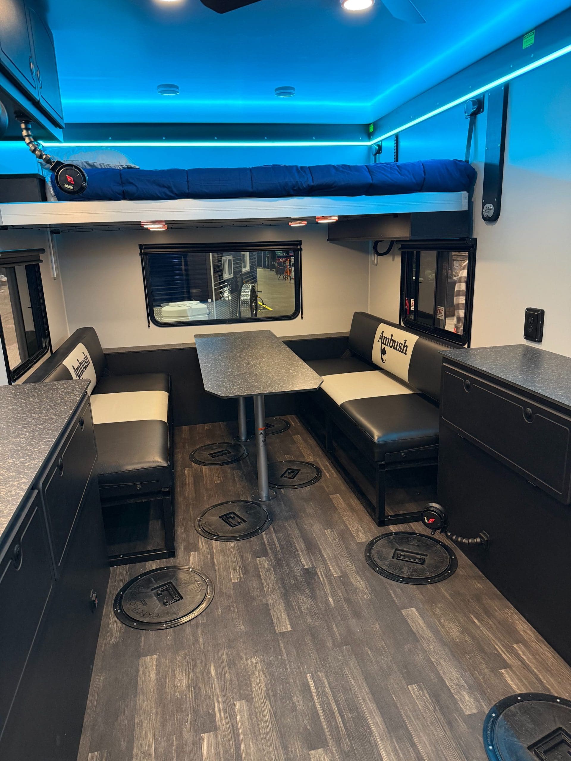 The Ambush Conquest 220 is our flagship wheel house. At 8.5 feet wide, the Conquest is our biggest and most well-equipped ice fishing house. No other wheelhouse on the market today can compare to the all-new Conquest 220. The roof, walls, and floor are all seamless panels, and the new hydraulic system lowers the entire house down to the ice without the need for a pivoting tongue. This is all accomplished with one click on the wireless remote. Strength and durability are ensured by a full-perimeter aluminum frame and 100% composite SIP walls, roof, and floor. Just like everything we build, the Ambush Conquest 220 wheelhouse is built without wood. We even manufacture our own cabinets out of 100% composite materials, so there is nothing to rot or rust. When you set foot in the Conquest 220, you are immediately transported to an ice fishing paradise with everything carefully thought out. Fishing First is more than just a tag line; it’s our commitment to building the most fishable and resilient fish houses available today. Our meticulous attention to detail, focus on quality, and dedication to producing a fish house that will last generations are the reasons people look and say, “Oh, it’s an Ambush!”