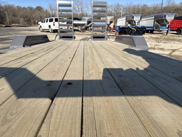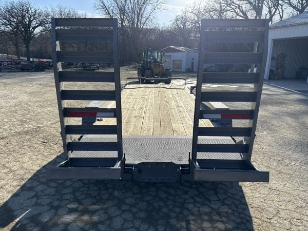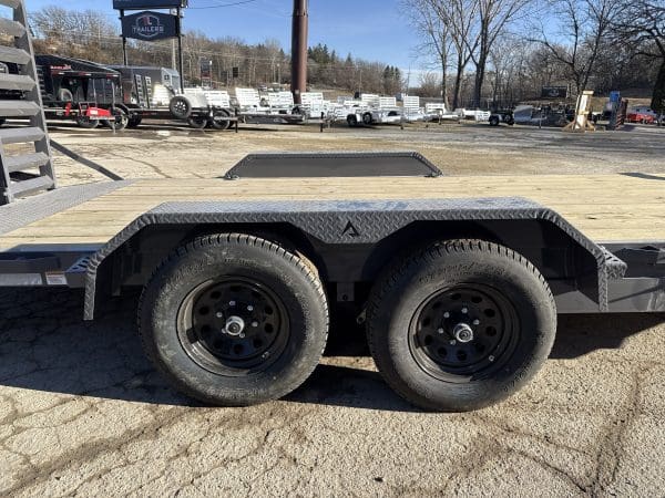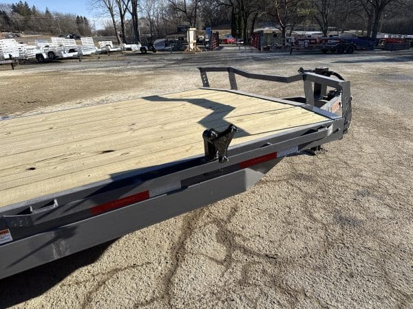 The ECX trailer is a sturdy, reliable heavy-duty equipment hauler, available in three different sizes: 16′ x 83″, 20′ x 83″, and 24′ x 83″. It can handle a maximum weight of 14,000 lbs. and has an impressive load capacity of 12,558 lbs. With a deck height of 26″ and a 2″ treated lumber deck, this trailer can handle heavy equipment with ease. Its 6″ channel main frame and 3″ channel cross-members, spaced 16″ apart, provide strength and durability. The two electric axles have a rating of 7,000 lbs. and feature 10-ply radial tires for superior traction and stability. The ECX offers a range of options to customize the trailer to your specific needs, including axle configurations, tail options, and deck options. The powder-coat finish ensures the trailer will look good for years to come, and it comes with a 3-year structural warranty and a 1-year paint warranty. Safety features include 3/8″ G70 safety chains, an electric breakaway kit, and 3M DOT-compliant reflective tape, making this trailer a safe and reliable option for hauling heavy equipment.
